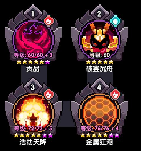 注:优先升级金属狂潮等级,可以考虑凑34冷却,实现贡品和破釜沉舟的全局覆盖。