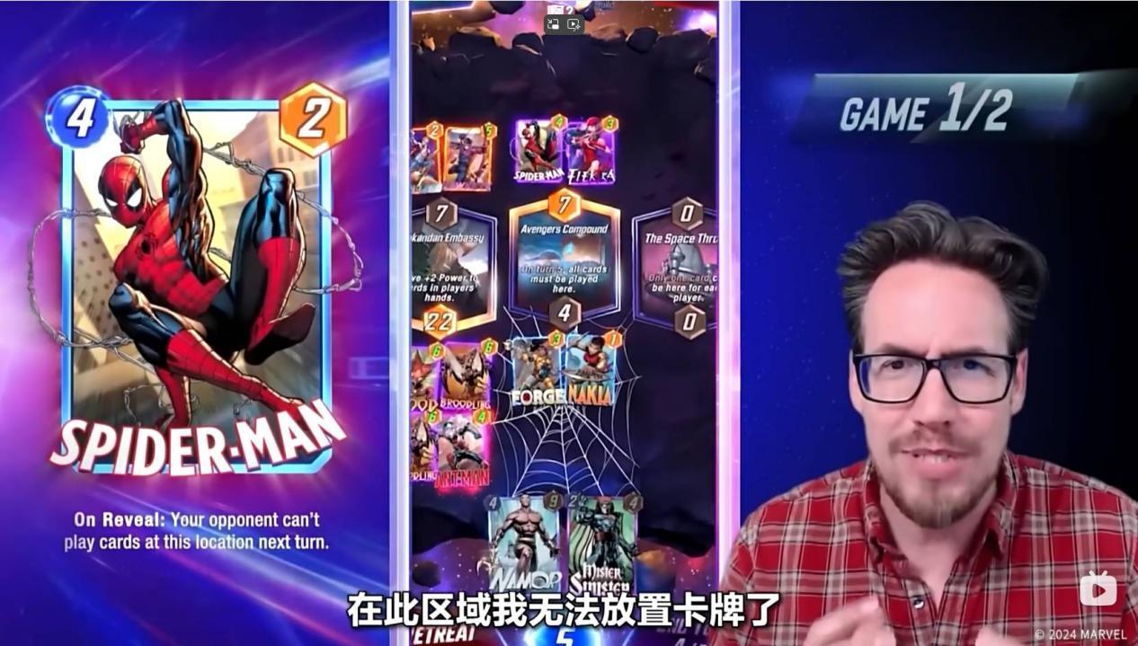 不好!对手第四回合时在复仇者基地放置了蜘蛛侠,这样下一回合Ben Brode就没办法在这个区域放置手牌了。但是第五回合时,区域又限制了Ben Brode只能在这个区域放置卡牌,这意味着Ben Brode将会完全放弃第五回合,真是一套漂亮的Combo!