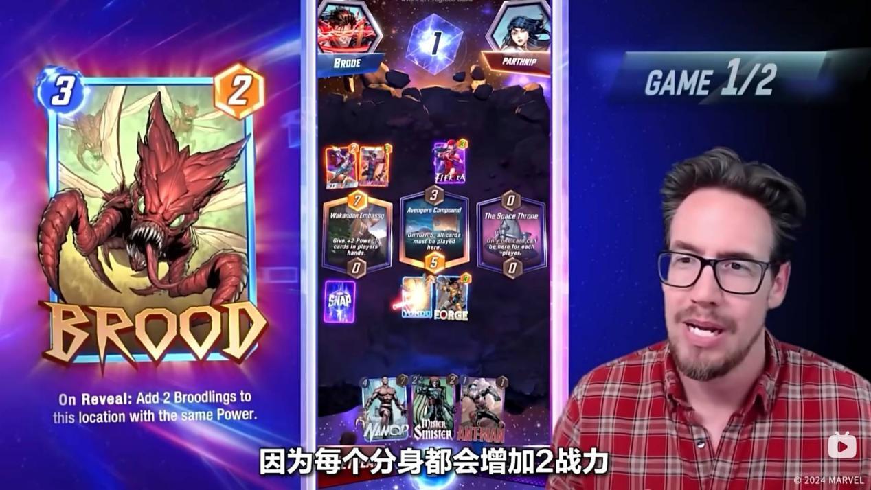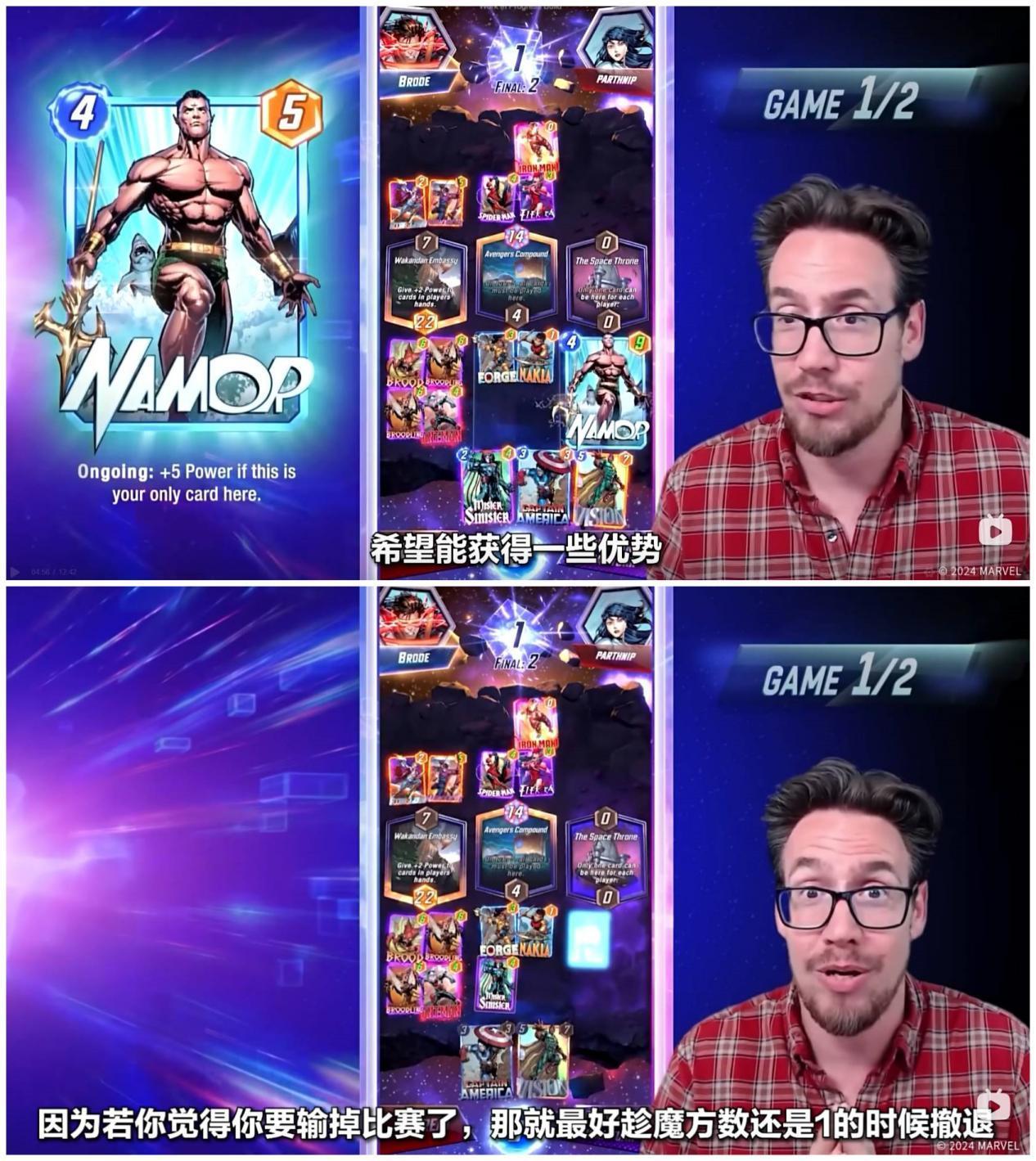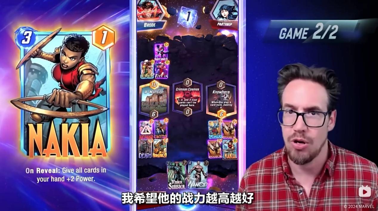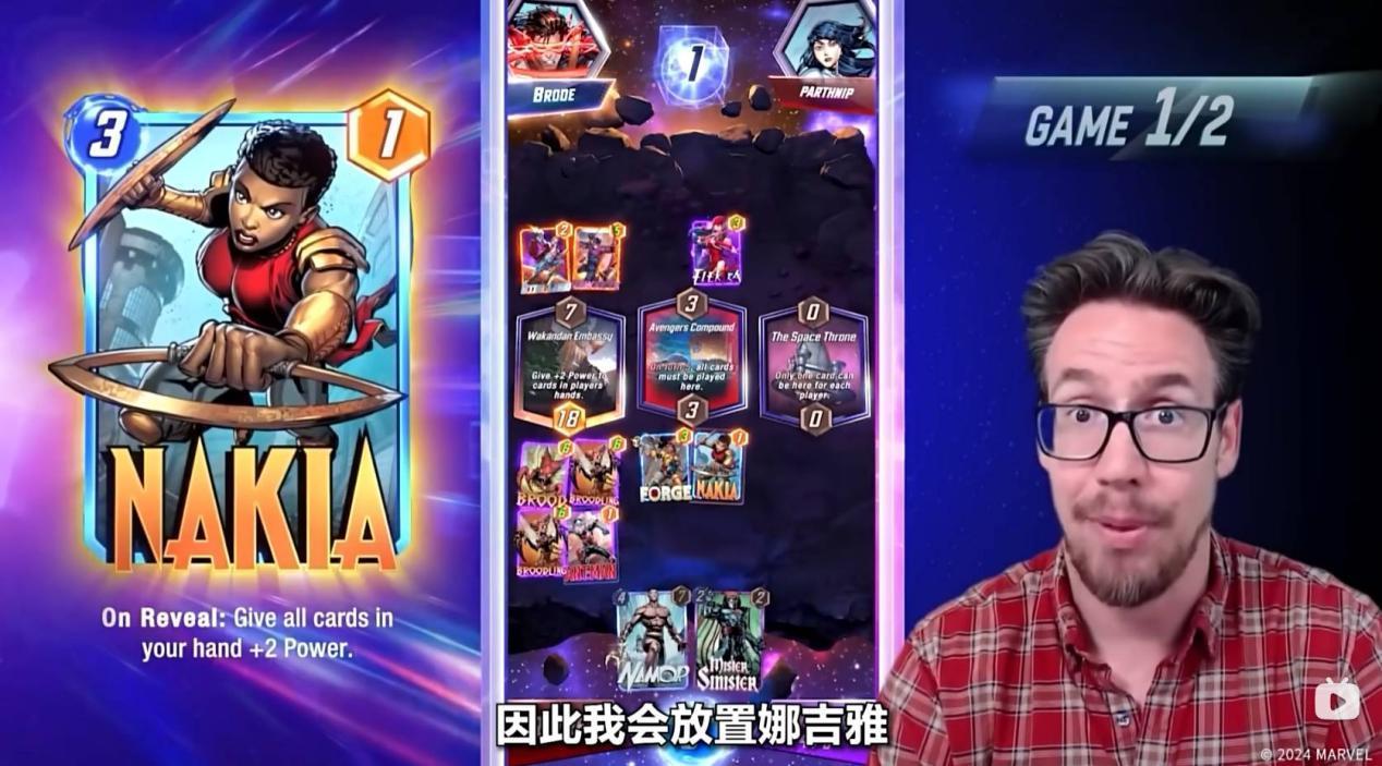 第六回合,Ben Brode只能将纳摩放置到太空王座上,纳摩在某个区域内,如果只有他一张牌,则会增加五点战力。到了狭路相逢的时刻,对手也非常可能在太空王座放置一张大战力的卡牌来取得胜利。值得一提的是,最后一回合魔方数将会翻倍,如果你觉得自己可能会失败,那就可以选择撤退。