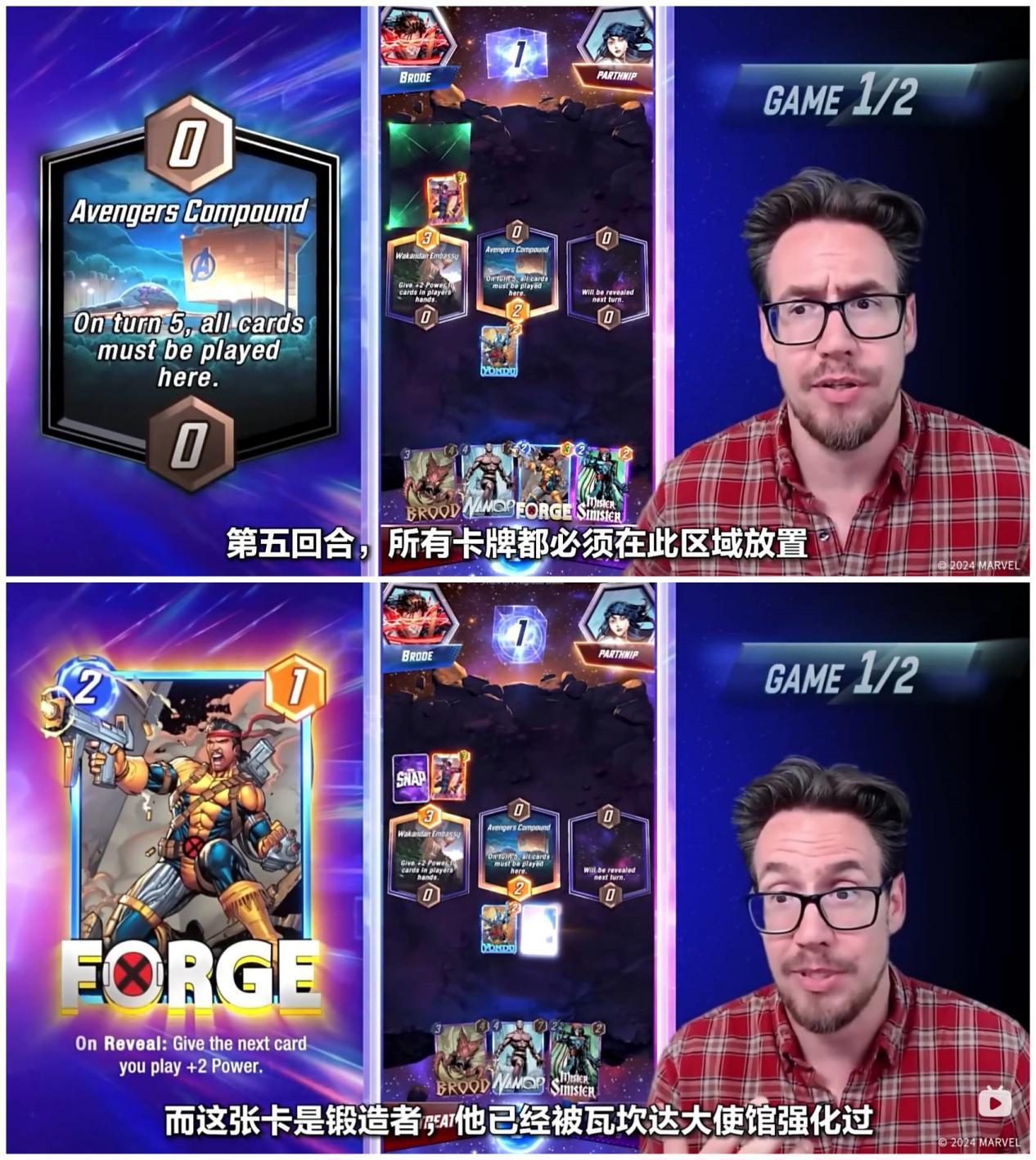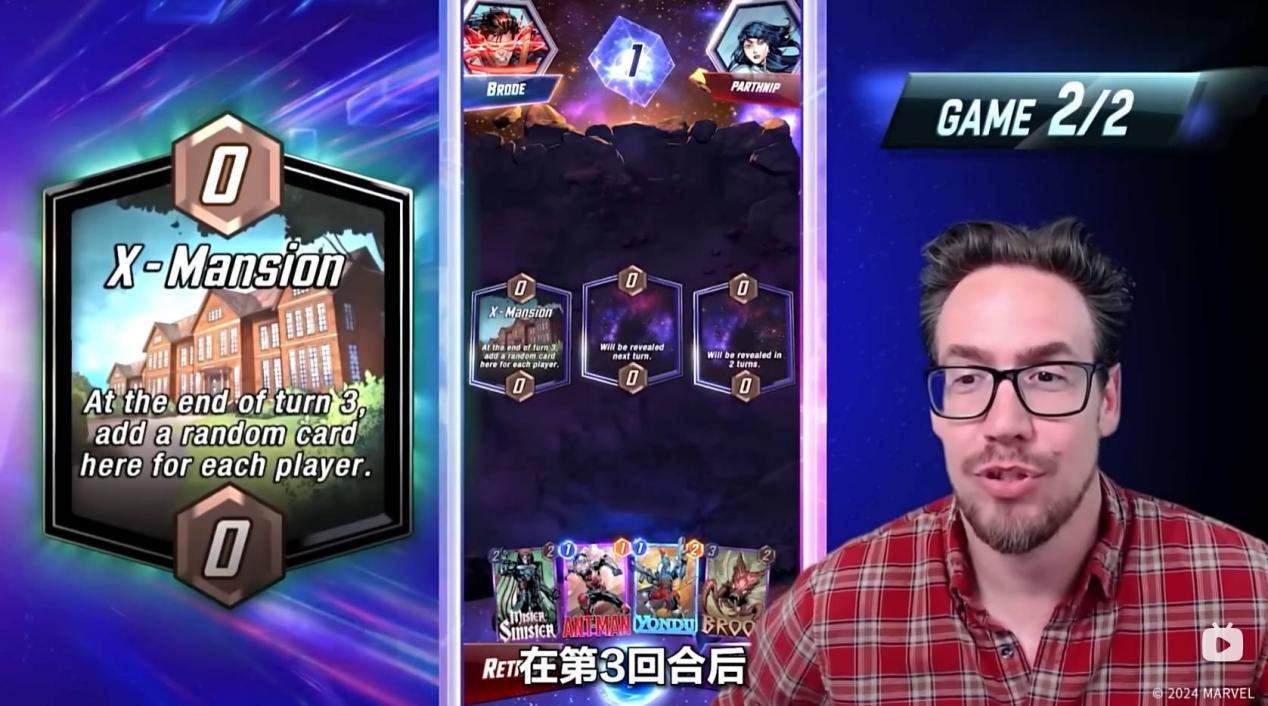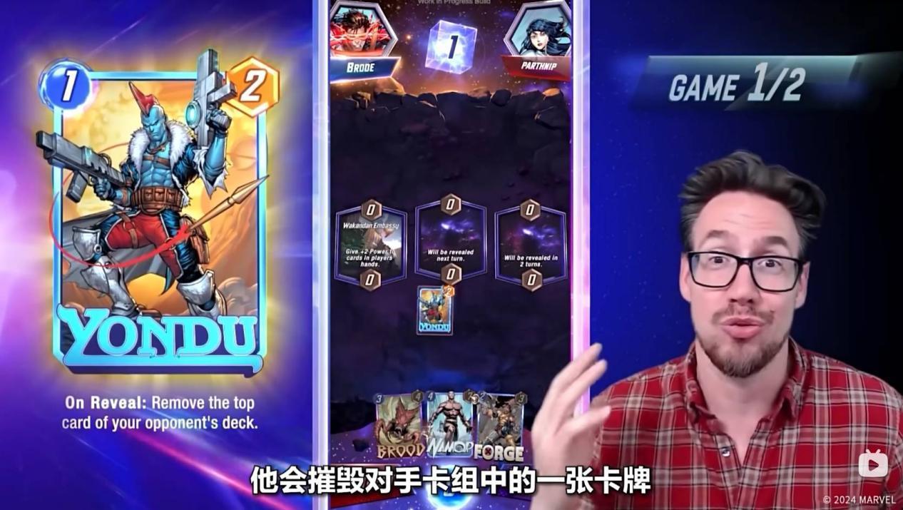 而第二回合,开启的区域是复仇者基地,意味着第五个回合,双方必须把牌放置到这个区域,Ben Brode选择了使用锻造者,以此来强化自己的下一张牌。
