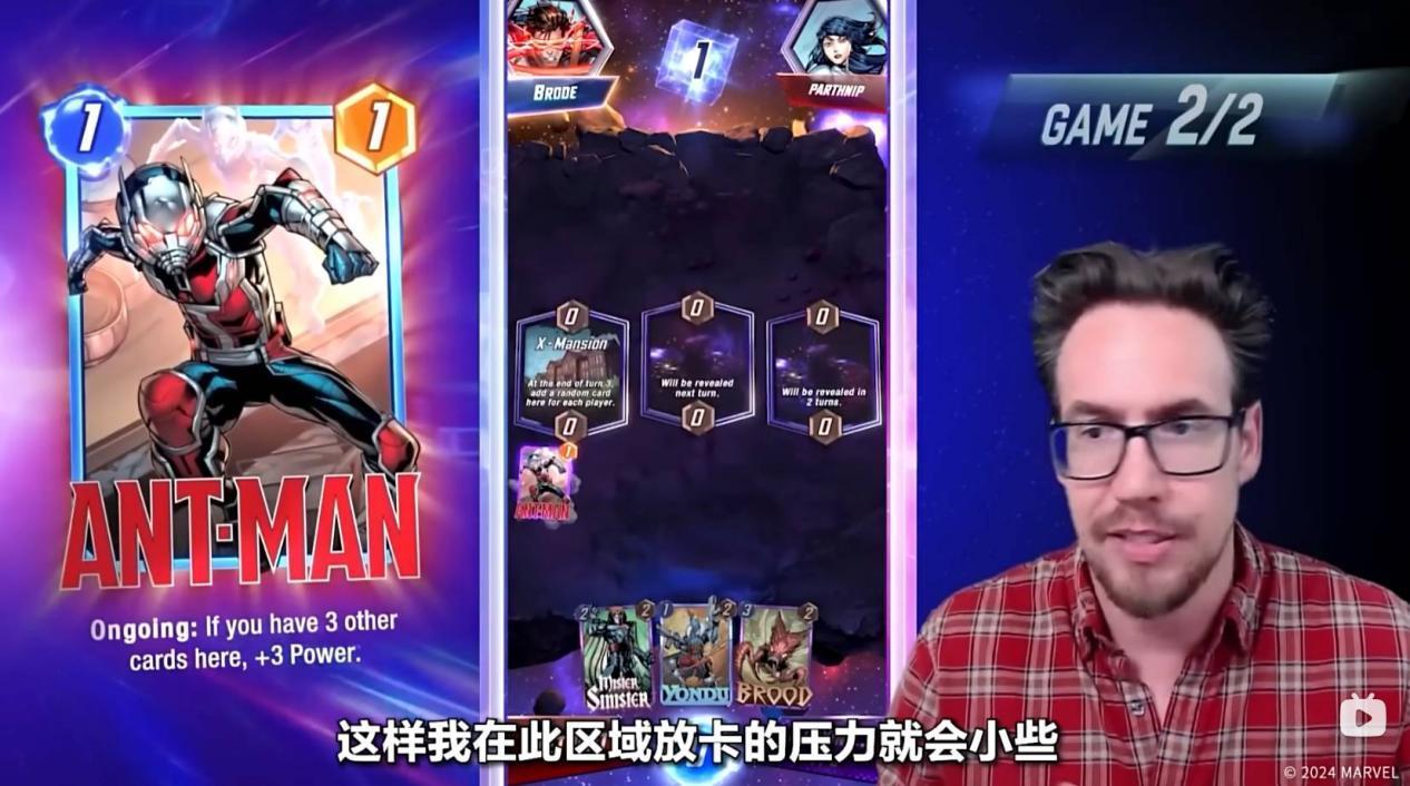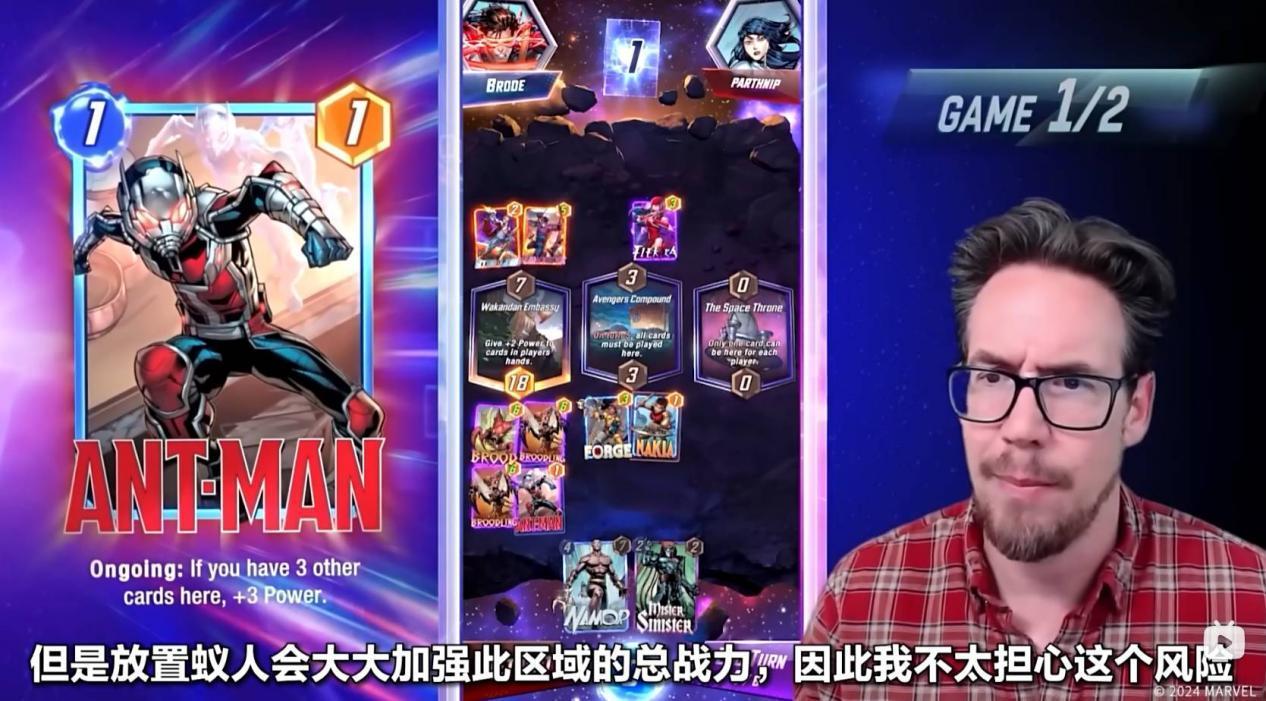 Ben Brode还在左侧的瓦坎达大使馆放置了蚁人,可以大大强化自己在这块区域的战力。但是Ben Brode也提醒大家,在放置某个区域的第四张牌时,必须要谨慎,因为这样对方就可以知晓你在这个区域的最大战力了!