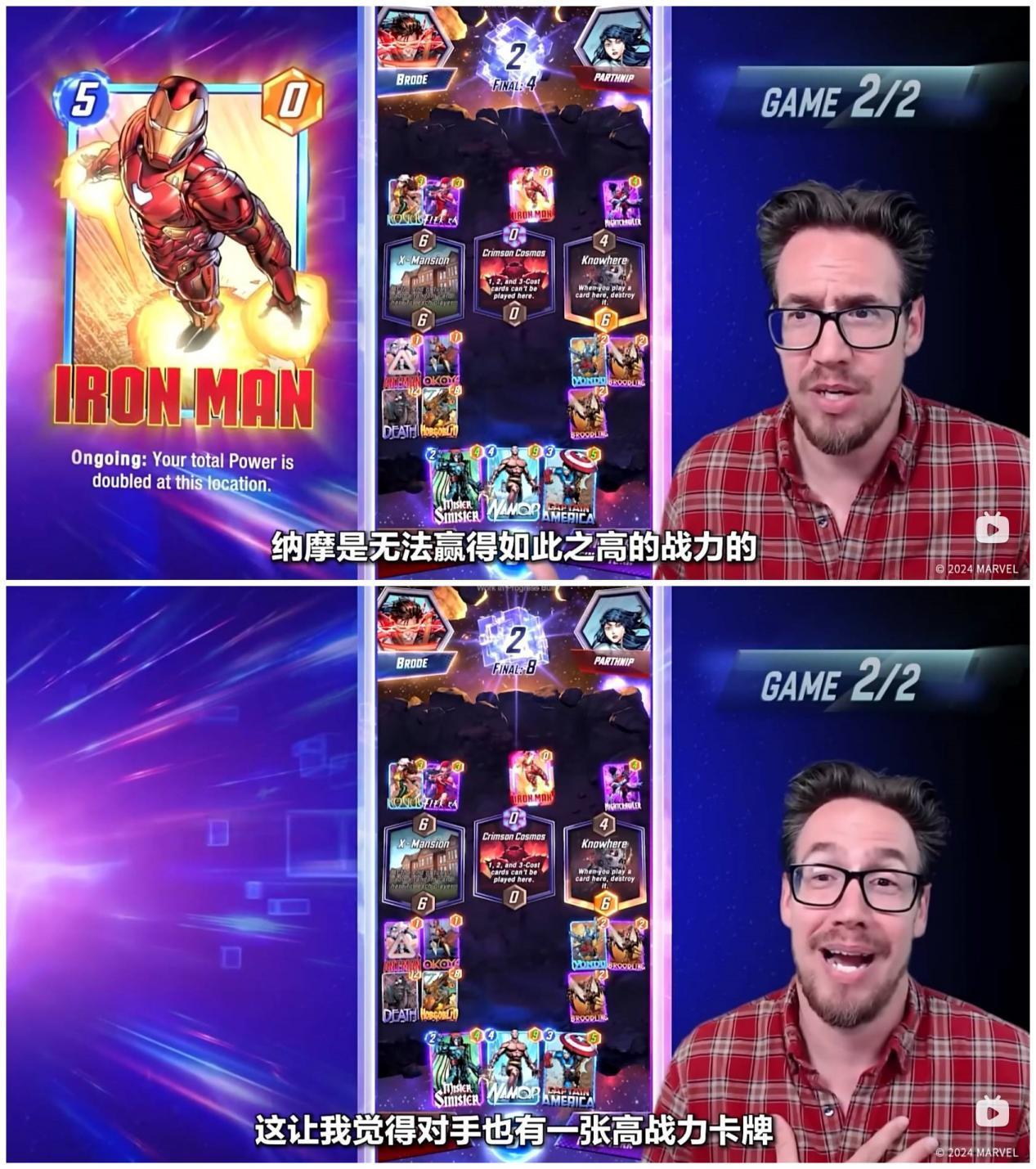 第五回合,对手在这个区域放置了钢铁侠,钢铁侠会翻倍这个区域内所有友方卡牌的战力,那么如果对手在最后一个回合中放置了浩克等强大的手牌,战力就会翻倍到22甚至更高,纳摩是无法赢过的。对手在此时也点击了SNAP!看来对手手中可能会有一张强大的手牌,保证他能在深红宇宙的拼点中取得胜利…
