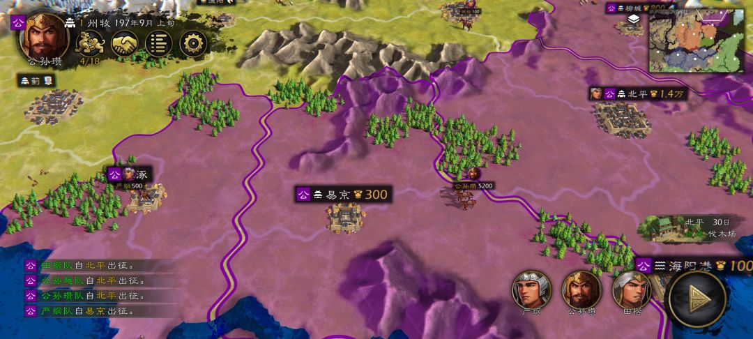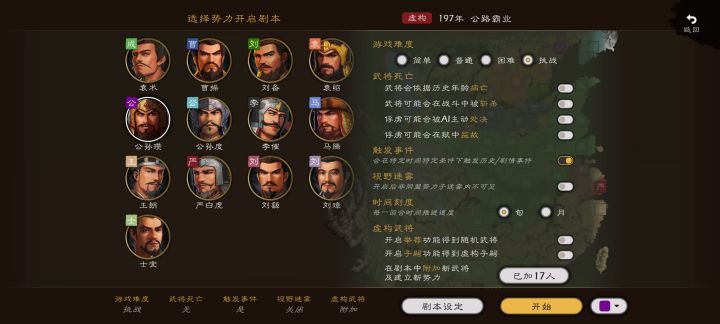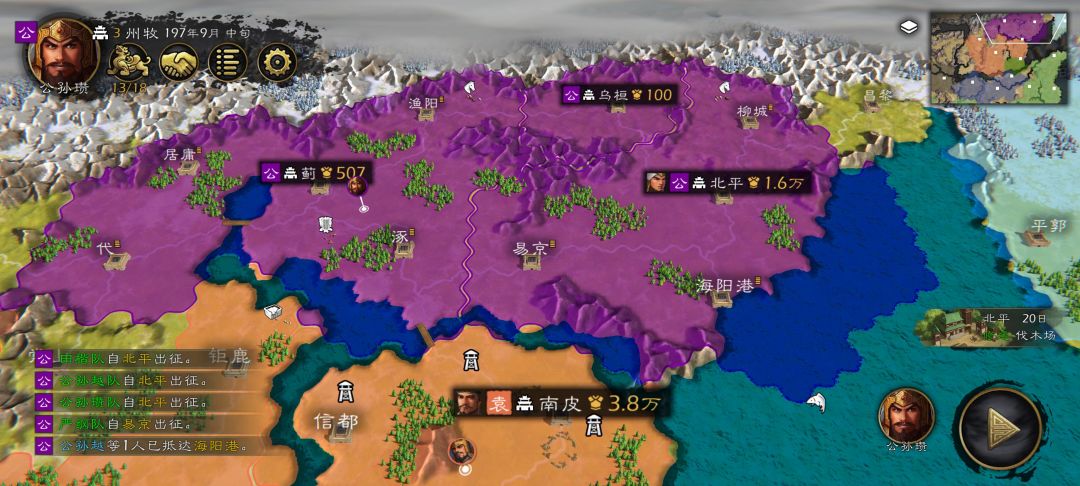 17个自建武将给袁术,开局光速占空城,易京的严纲第二回合占蓟城,。公孙瓒有急行军从北平出发把兵运到蓟城。田楷占乌桓。公孙越占海洋岗。我这sl袁绍没有第一时间抢蓟城。开局就完成 接着就是不断探索