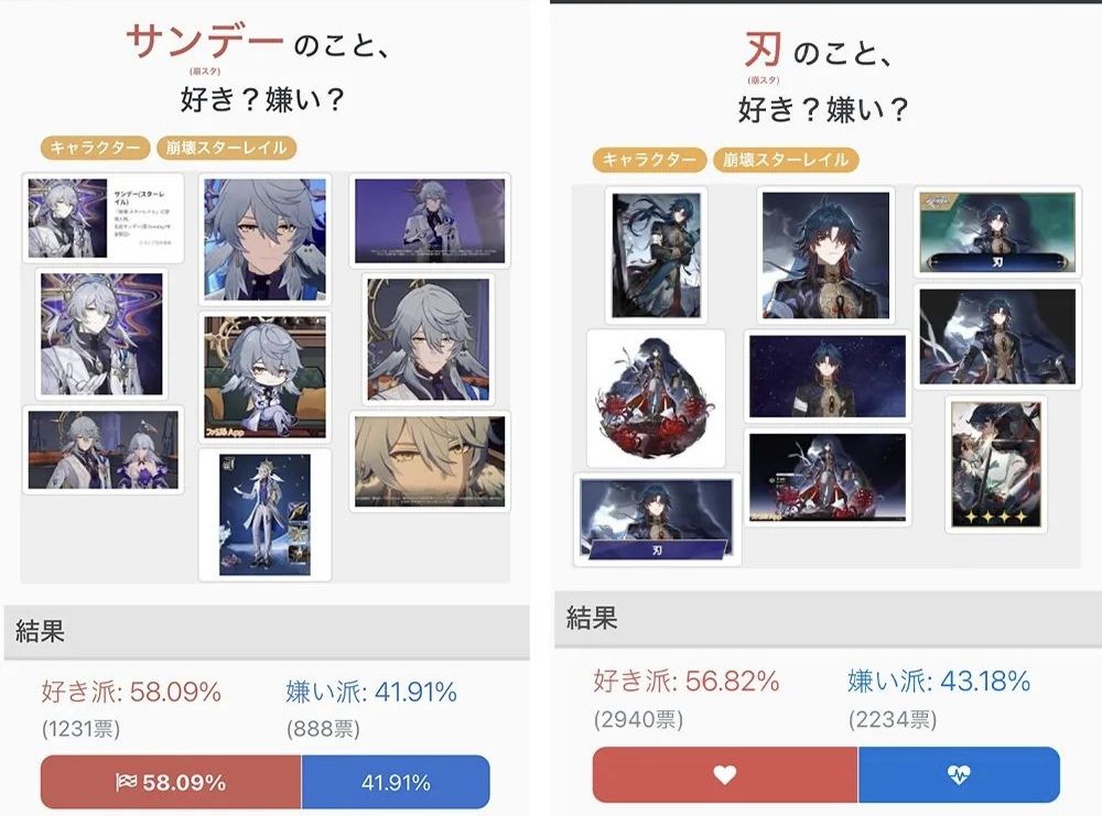倒数第九名刃,上榜理由:醉犯,粉丝腐女太多,单纯的讨厌星核猎手,投票数据上,喜欢的人有56.82%,讨厌的人有43.18%。