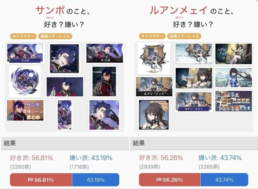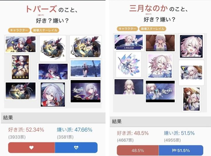 倒数第五名三月七,上榜理由:不知轻重,性格差,投票数据上,喜欢的人有48.5%,讨厌的人有51.5%。