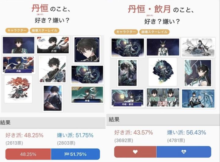 倒数第四丹恒,上榜理由:粉丝腐女太多,重生之后换了名字就好像干过的事情和自己无关了,明明说共犯却总是一副和自己无关的样子,投票数据上,喜欢的人有48.25%,讨厌的人有51.75%。