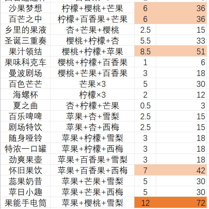 以下六张图是以施第二快的肥为基准(施别的肥都没这么划得来),同时以开三块地为前提的数据计算。第一个利润是一瓶果汁售价的利润,第二个30分钟利润是以三块地30分钟种两茬,两个果子两茬出9瓶,三个果子两茬出6瓶为基础。