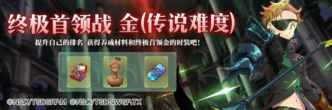 活动介绍:终极首领战金(传说难度)登场!灵活编辑挑战队伍,击败终极首领,获得钻石、SSR进化项链、SSR必得券等丰厚奖励!消灭终极首领获得的点数,还可兑换丰富养成材料,快来挑战吧!