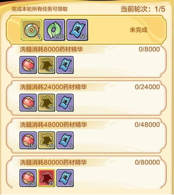 2、每期活动所需材料数量不同,其中:第一期药材活动每轮消耗20000药材精华,5轮奖励拿满所需100000药材精华。第二期药材活动每轮消耗80000药材精华,5轮奖励拿满所需400000药材精华。