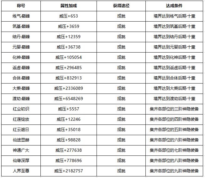 1、所有称号加成威压是累加的(如练气巅峰威压+653、筑基巅峰威压+3659,那么合计为653+3659=4312点威压)
