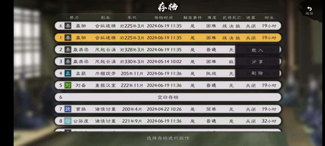 在存档界面点击存档会显示出菜单栏,载入、分享、删除;