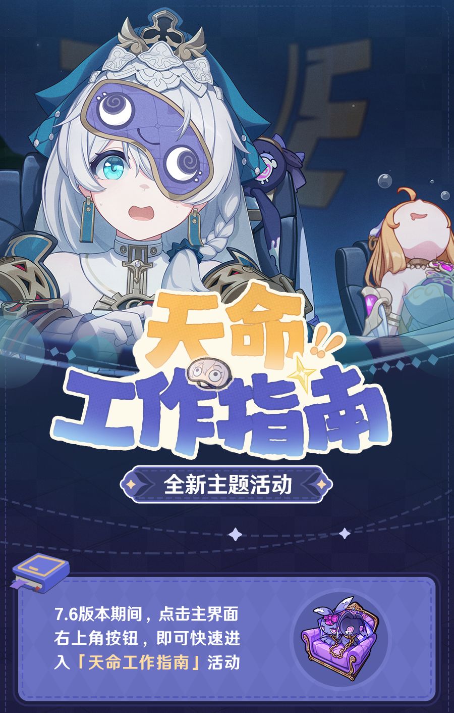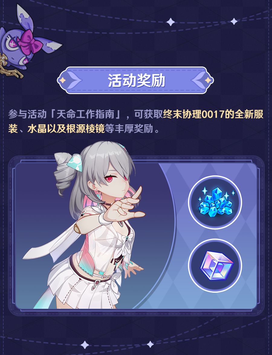 舰长好,7.6版本将开启「天命工作指南」主题活动。参与活动可获得终末协理0017的全新服装「碳酸射线」、水晶以及根源棱镜等奖励。