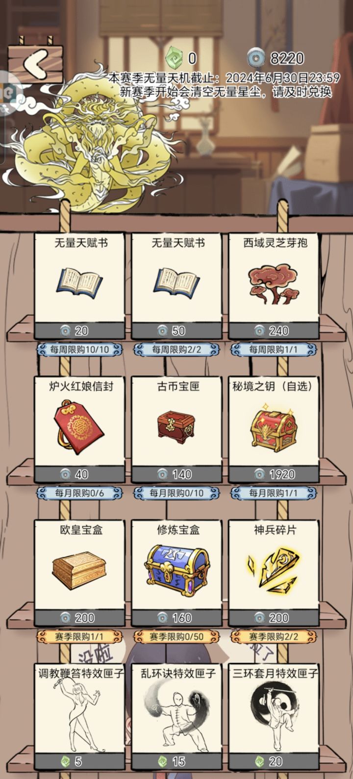 1.开始每周换满无量天赋书,西域灵芝芽孢;福地绝学未满的每月可以换一个;每季度换满欧皇,没有神兵的换神兵碎片,剩余的换修炼宝箱,可开出九转、寒玉、根骨丹、无量书签、武学残章,是目前白嫖无量书签、武学残章的主要方式。