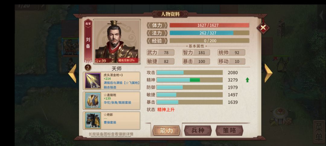 1.天师刘备,装备其实可以随便带,这里带了快乐枪和绝影,可以跑快快,但实际上并不需要这么多移动力。需要用天师的状态恢复和调度让百姓快速移动。