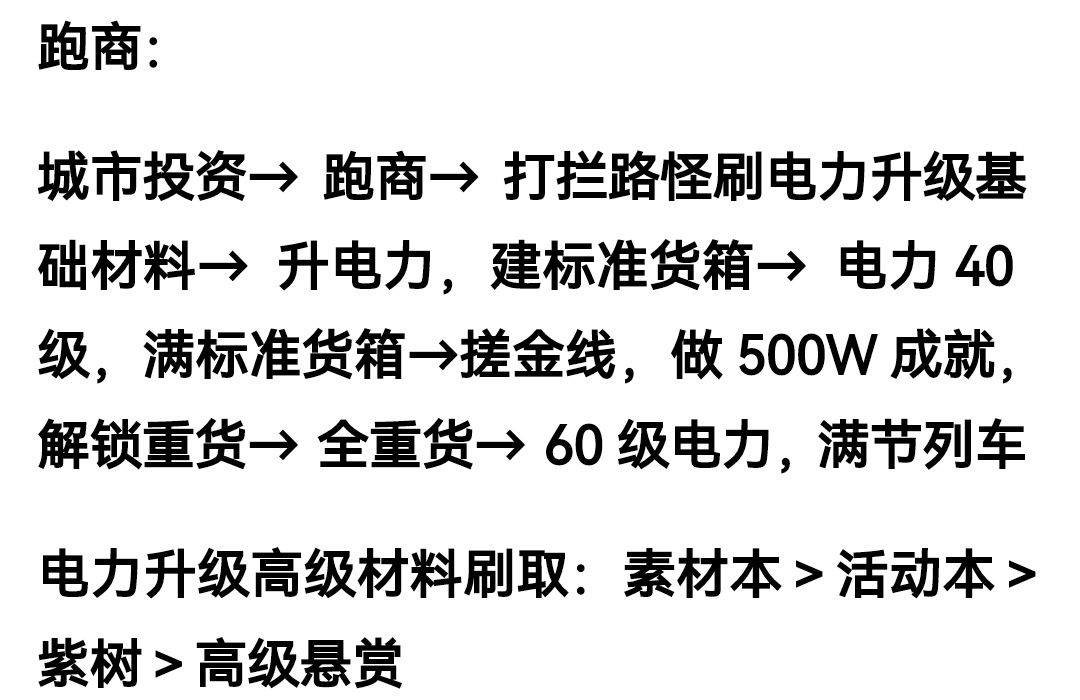 当你电力等级达到40级有4节车厢并且完成投资流程时,你才能进入下一阶段(没达到的可以退出去了,以后再来来看