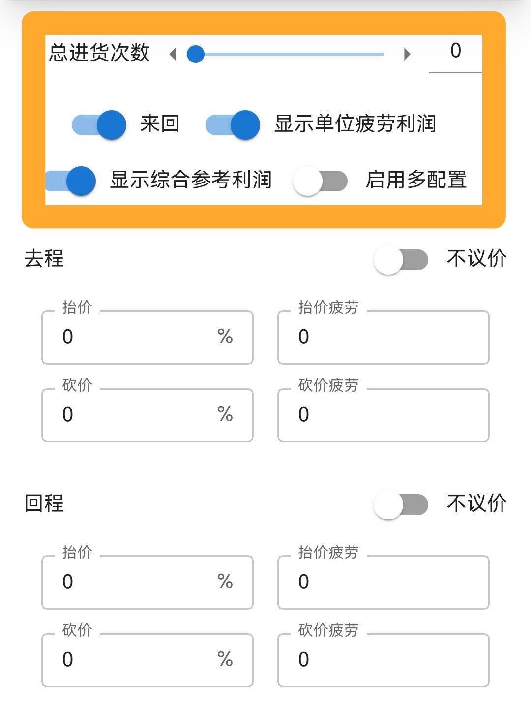 往下滑,总进货次数是你使用进货书的次数,打开来回,疲劳利润,综合利润的开关