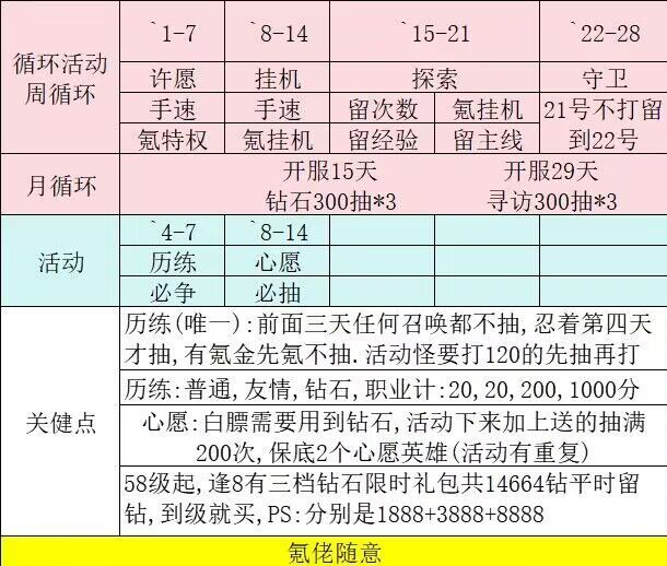 玩家应正常囤积资源,15天出召唤活动,注意召唤和寻访活动通常以300抽为一轮每月3轮,月初重置,若达不到300抽可等下月。15同时出西游活动及花木兰活动,花木兰为强力英雄,可根据自身钻石情况适当抽取,活动期内应该可以抽一个,兑换一个。