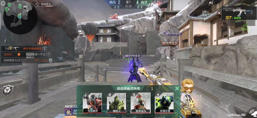 如果当局buff是跳跳乐,那么生化幽灵玩家可以选择激进一点的破点方法。角色建议选择变异宝贝,注意,一定要是变异宝贝!因为变异宝贝不仅能隐身,在隐身状态下还能提速,是破点的最佳选择。借助右下角弹簧的弹力,我们可以神不知鬼不觉的飞到不周山上,给在山上打狙的人类佣兵迎头痛击!