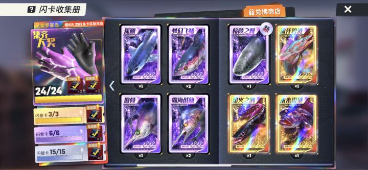 免费钓齐了,前面还没有,这次齐了,我分享一下自己的心得,首先这是免费钓的啊,体力废了多少我没算,我的钓法就是无限刷20黄金池,因为我没时间去玩,基本每天上线就是10体开宝藏,然后20题钓鱼,进图卡渔场,第一次进宝藏图必出典藏(红色)最少一条,而且有极大概率出卡,钓完以后我就休息了,如果肝帝,交易去钓3题或1体,最少10分钟以后再去开宝藏,但是后面开的就不一定有典藏了