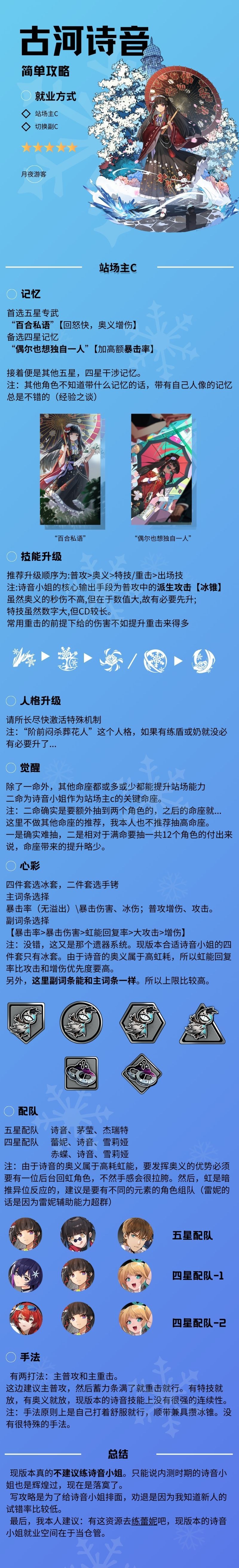 古河诗音作为我们不花钱就能拿到的冰系五星角色,在我们的游玩过程中,有时也能发挥出不俗的作用,以下是古河诗音的角色测评以及心彩推荐,各位所长请慢用。