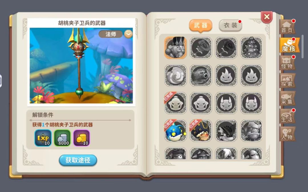例如魔核手册中,有各种不同的魔核总览,每当收集到一个的新魔核就可以点亮对应的图标,点亮图标后玩家可以获得一定的经验值、银币、金币和勇士徽章的奖励。手册图鉴非常多,通过收集开启图鉴也能获得不少的资源。