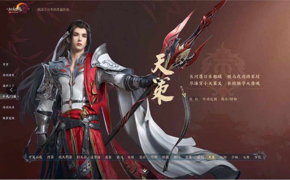 天策是大唐统管江湖事物的部队,和现在的军人概念相似。这个门派进攻防守都很均衡,一大特色就是可以骑马作战,高血量高外放高机动,在野外战斗可以冲阵杀敌,也能全身而退。