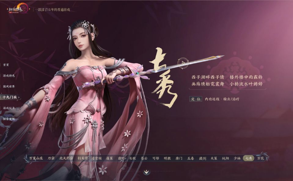 七秀这个起源于杭州西湖,是一个纯女性门派,服装和技能非常华丽。
