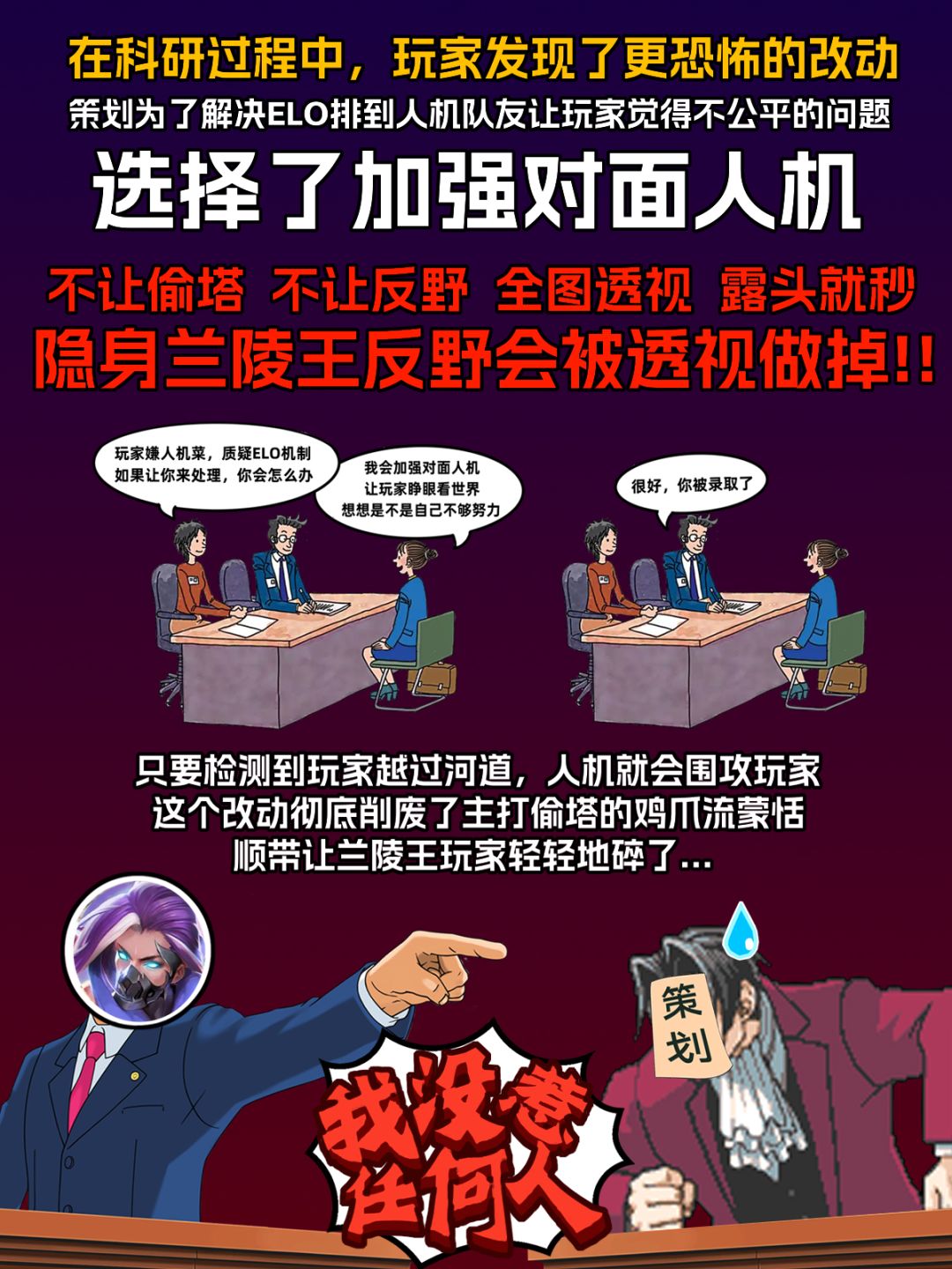 然而仅仅四天,6月16日磊哥再次掏出科研成果——遛鸟流元歌。磊哥选择使用元歌,本体在塔下打鸟,分身在河道处缓慢推线。因为分身不会被视作英雄,通过分身推线护送兵线推塔,就算小兵一路推上高地推爆水晶,因为没有写为了小兵回城守塔的程序,人机只会一边打团一边看着小兵把自己家推平。策划挠破头想出的人机热补丁又一次在磊哥的科研下沦为笑柄。