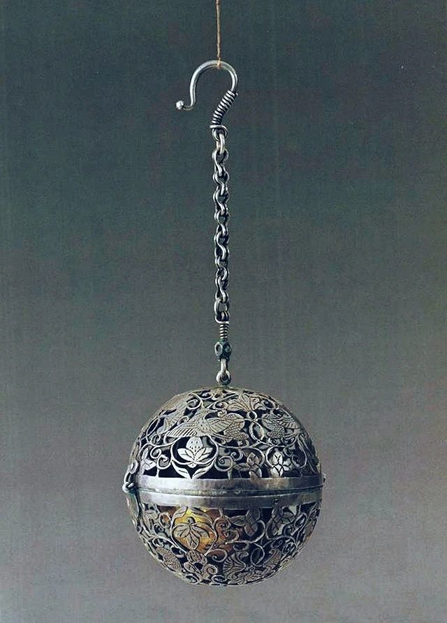 「按香囊者,烧香器物也。以铜、铁、金、银玲珑圆作,内有香囊,机关巧智,虽外纵圆转,而内常平,能使不倾。」——《一切经音义》