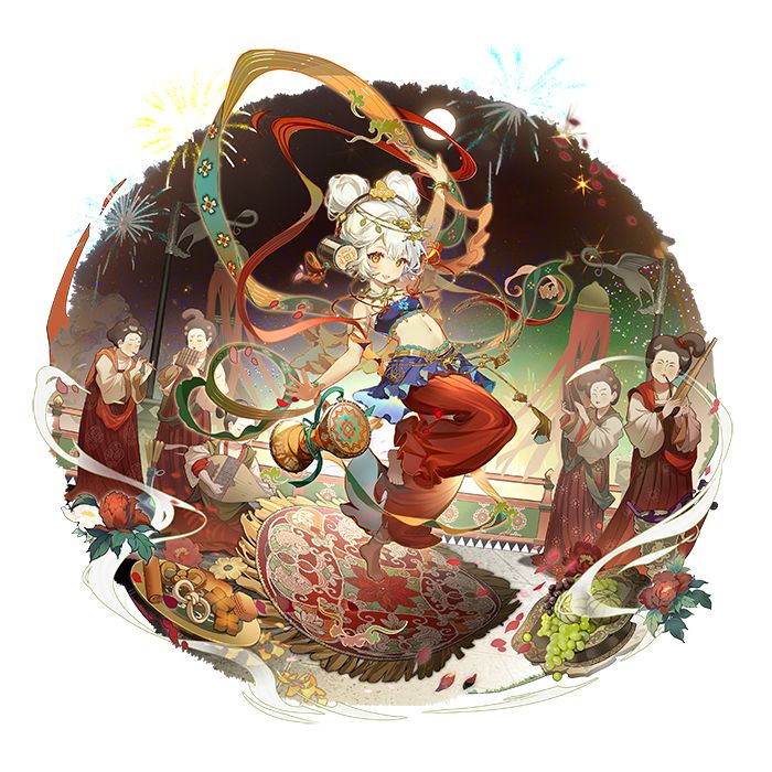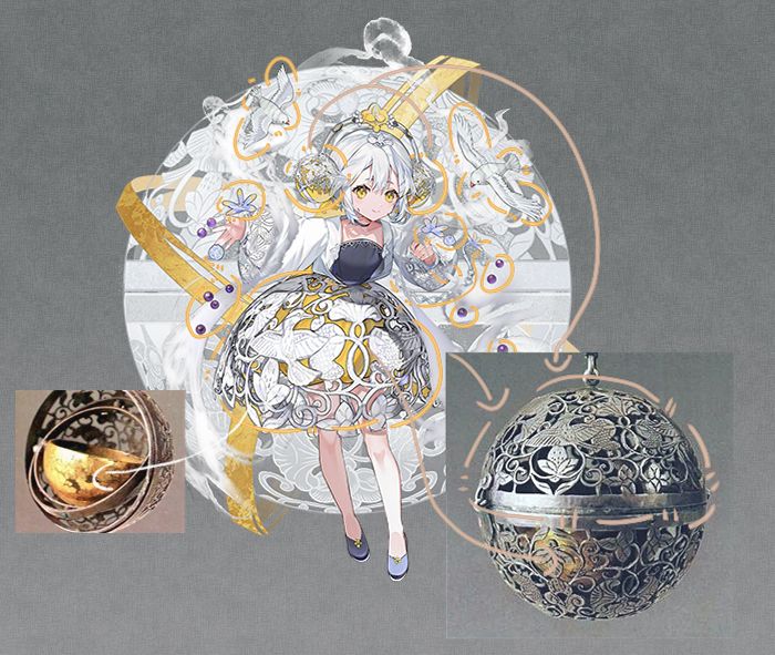 在游戏的立绘中,器者的形象是一个小巧玲珑的少女,背后是银香囊的文物本体,整体采用了银白+黄的配色。器者头上佩戴着一个别致的装饰物,耳畔两侧的装饰状似精美的银香囊;手边散落着葡萄和花,身侧有小鸟在飞舞,可以看出,这些设计元素汲取了文物的灵感,让整个画面充满了生机与活力。