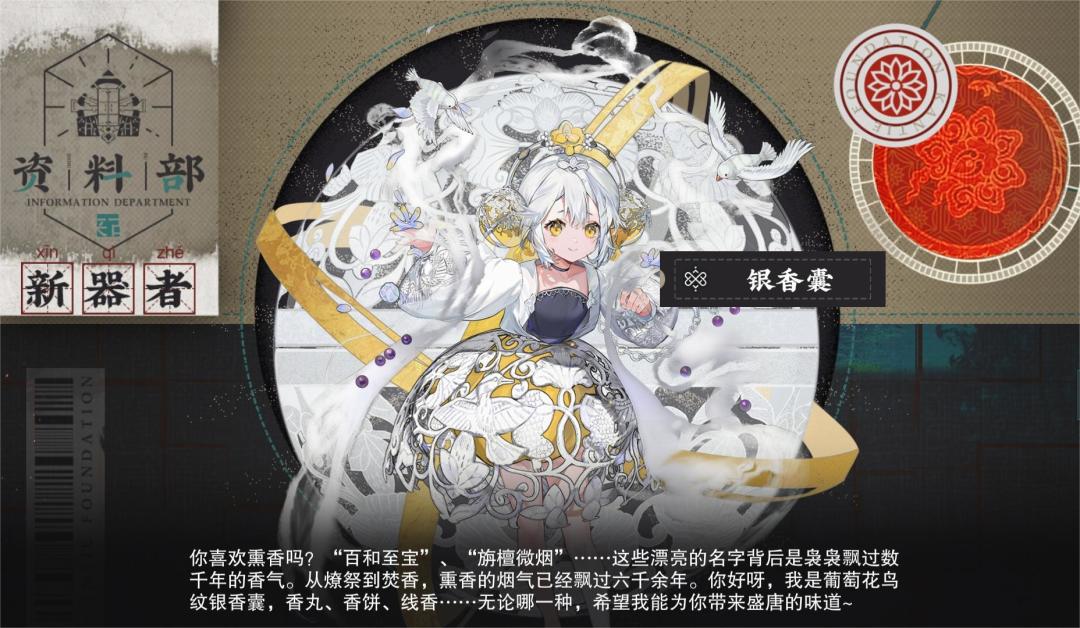 「......从燎祭到焚香,熏香的烟气已经飘过六千余年。你好呀,我是葡萄花鸟纹银香囊,香丸、香饼、线香……无论哪一种,希望我能为你带来盛唐的味道~」——游戏语音·招集