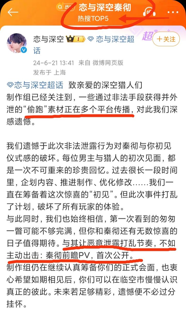 今天6/21中午,《恋与深空》发文回应新男主“秦彻”泄密!