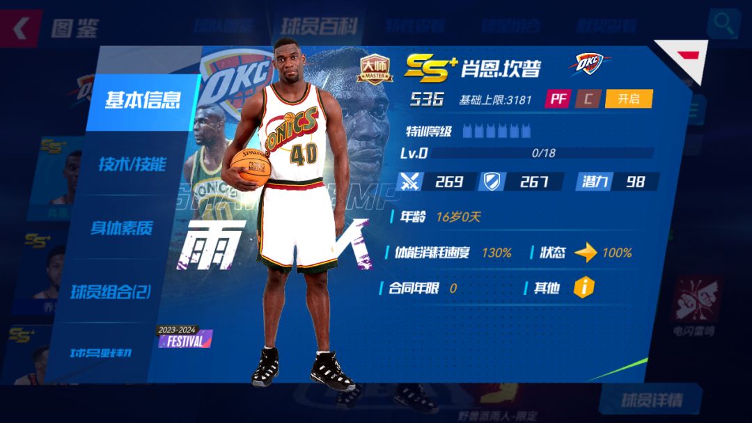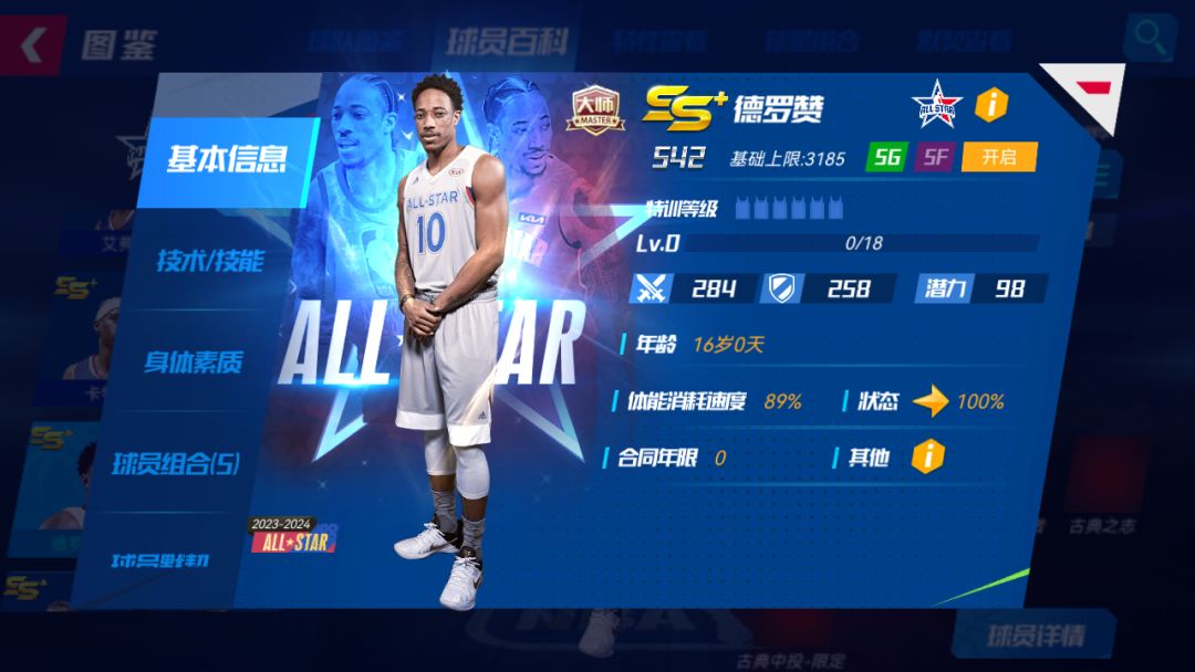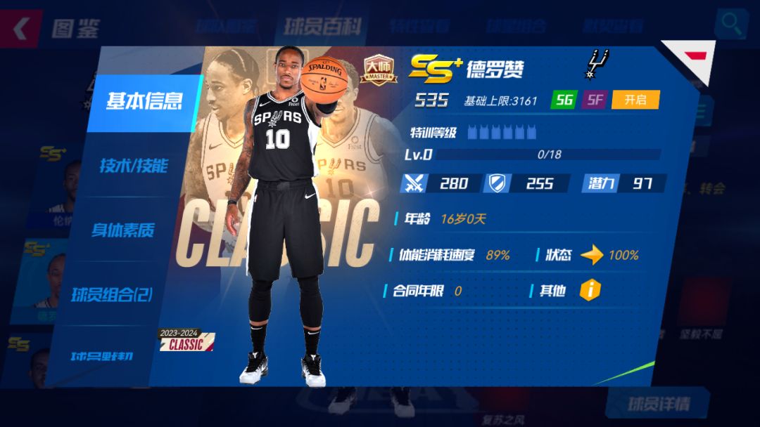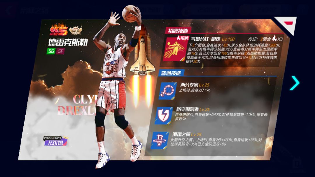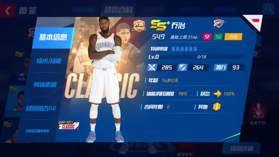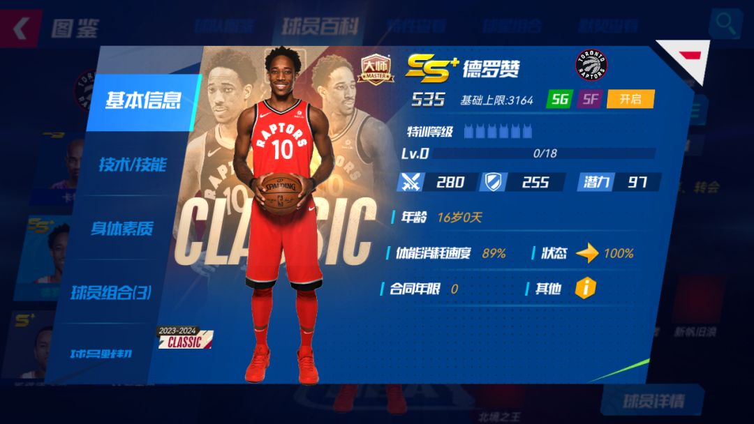 招牌技能:气贯长虹-限定:下X个回合,自身进攻+X%,双方全队体能消耗速度+X%;若对方有概率得分技能,对方直接得分概率降低为原概率的X%,且己方本回合X%概率获得Y点技能能量;若自身体能低于70%,自身招牌技能生效回合+Y,且己方特性效果提升X%升级宗师后球员详情界面: