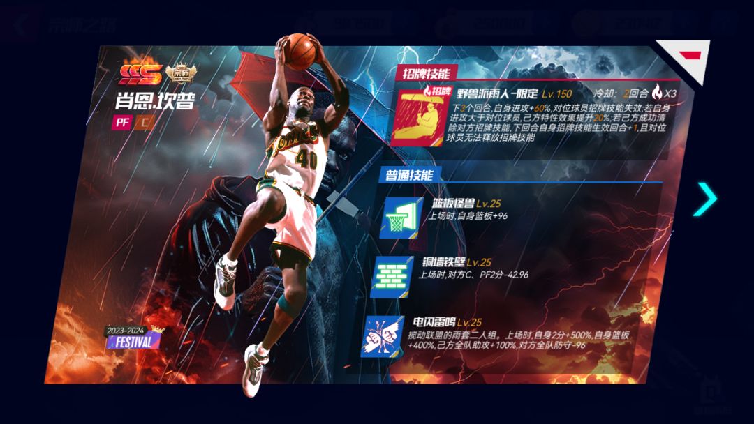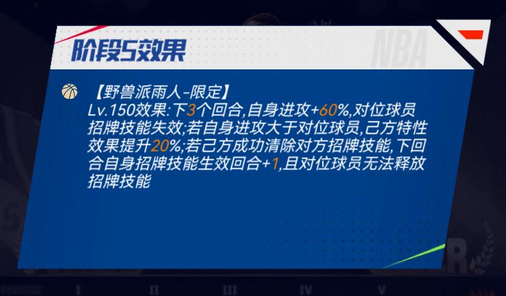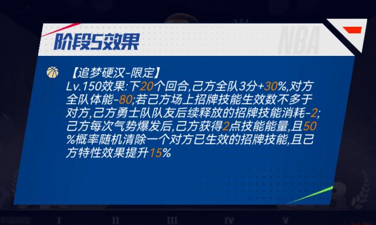 【招牌技能】追梦硬汉-限定:下X个回合,己方全队3分+X%,对方全队体能-X;若己方场上招牌技能生效数不多于对方,己方勇士队队友后续释放的招牌技能消耗-Y;己方每次气势爆发后,己方获得Y点技能能量,且X%概率随机清除一个对方已生效的招牌技能,且己方特性效果提升X%。(预计在上线同时开启迈向巅峰)