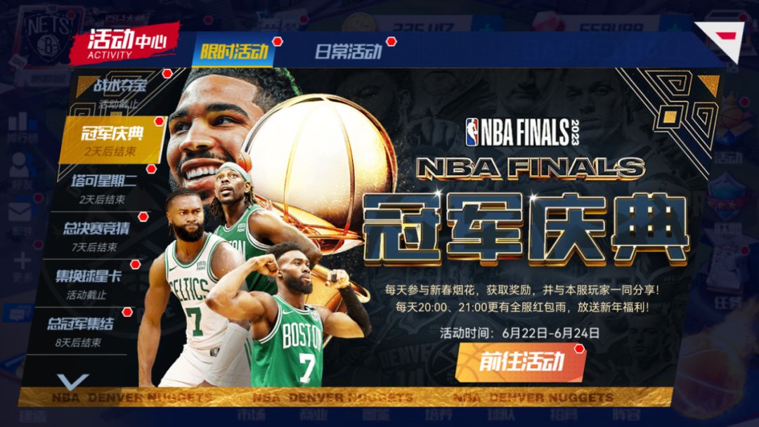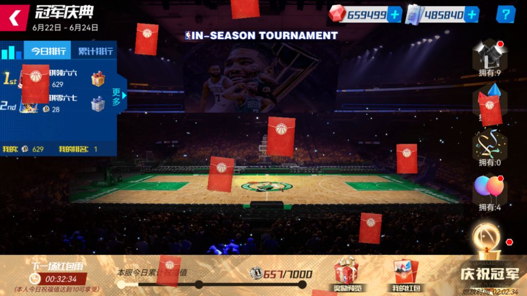 注:道具“闪耀全场”内,包含限定大师球员碎片;集齐120张限定大师球员碎片,可与以下任意一位随机限定大师球员进行签约(限定大师球员名单:2020季后赛巴特勒、名人堂加内特、2020季后赛詹姆斯、2020季后赛戴维斯、得分王安东尼)。祝福值达到一定数值后,在每晚20:00-20:30和21:00-21:30登录游戏,在游戏主界面和冠军庆典地都可以享受全服红包雨。本服所有玩家累计的祝福值越高,一个红包内奖励数量越多哦~