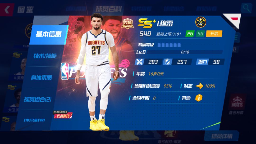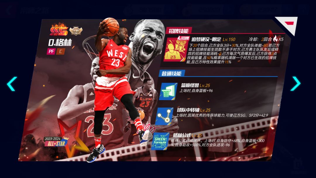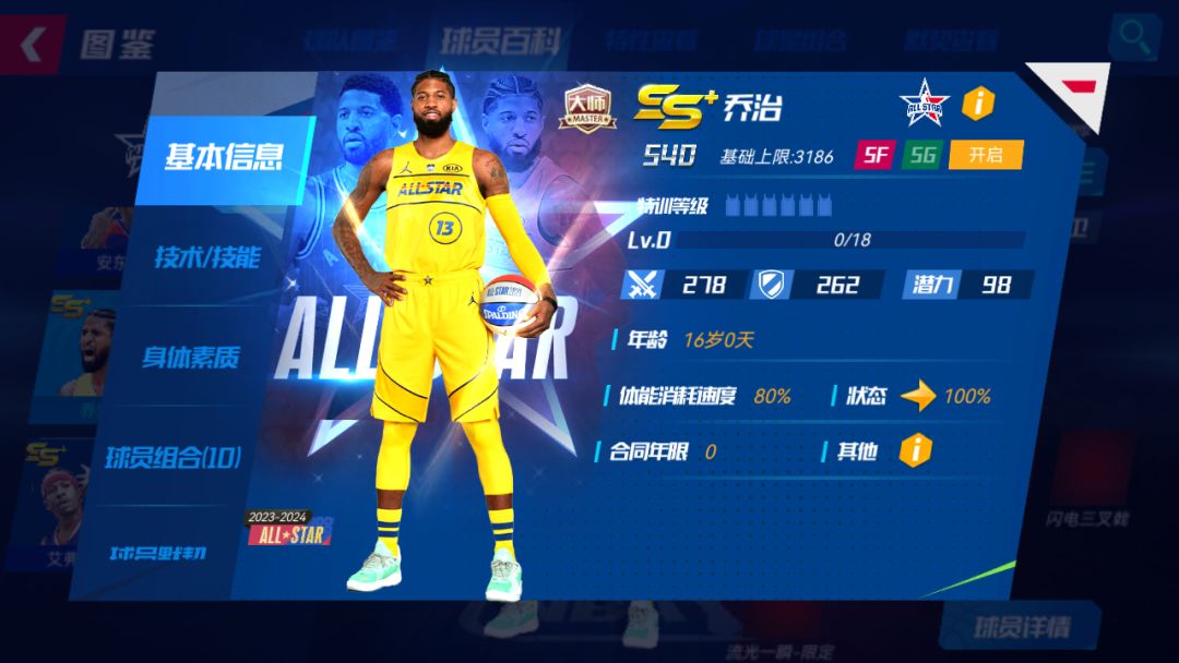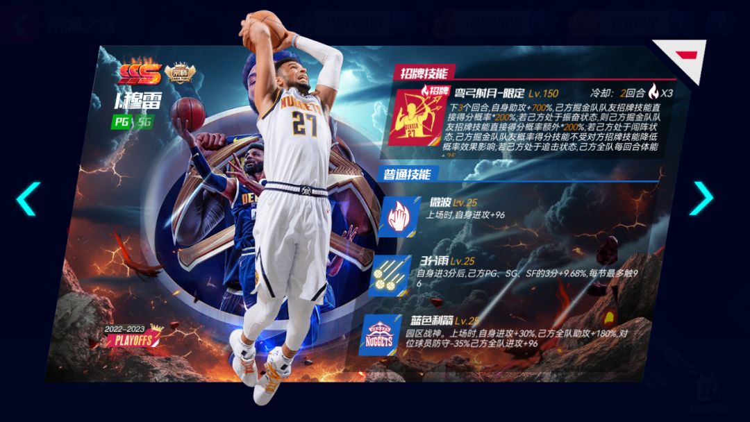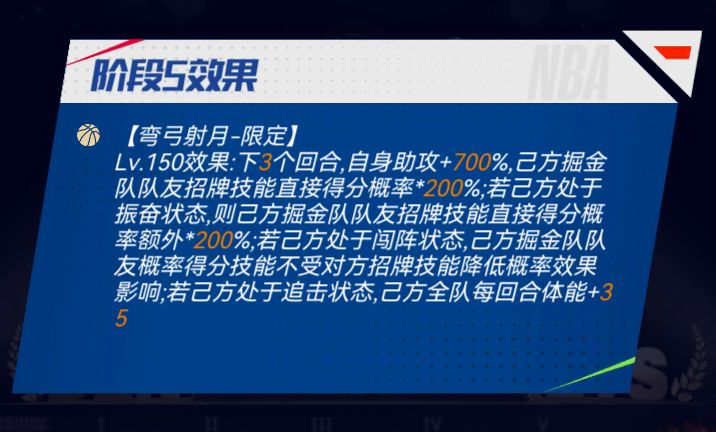 招牌技能:弯弓射月-限定:下X个回合,自身助攻+X%,己方掘金队队友招牌技能直接得分概率*X%;若己方处于振奋状态,则己方掘金队队友招牌技能直接得分概率额外*X%;若己方处于闯阵状态,己方掘金队队友概率得分技能不受对方招牌技能降低概率效果影响;若己方处于追击状态,己方全队每回合体能+X。升级宗师后球员详情界面: