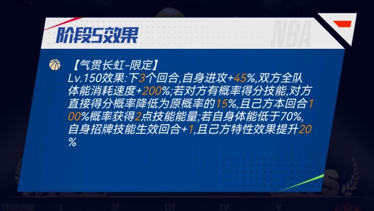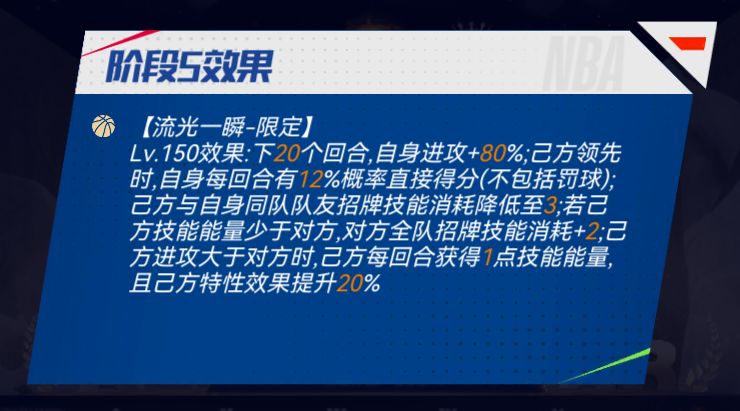 【招牌技能】流光一瞬-限定:下X个回合,自身进攻+X%;己方领先时,自身每回合有X%概率直接得分(不包括罚球);己方与自身同队队友招牌技能消耗降低至Y;若己方技能能量少于对方,对方全队招牌技能消耗+Y;己方进攻大于对方时,己方每回合获得Y点技能能量,且己方特性效果提升X%。(预计在上线同时开启迈向巅峰)