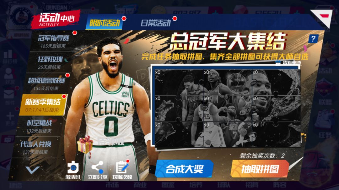 总冠军已经出炉,经理人们速来集结!游戏内完成限时任务即可获得抽奖次数,有机会抽到巨星拼图,凑齐全部巨星拼图后,即可合成大奖,领取SS+球员自选!