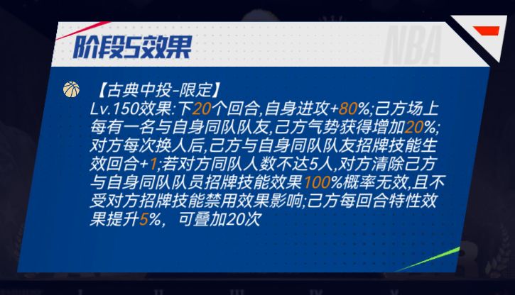 【招牌技能】古典中投-限定:下X个回合,自身进攻+X%;己方场上每有一名与自身同队队友,己方气势获得增加X%;对方每次换人后,己方与自身同队队友招牌技能生效回合+Y;若对方同队人数不达5人,对方清除己方与自身同队队员招牌技能效果X%概率无效,且不受对方招牌技能禁用效果影响;己方每回合特性效果提升X%,可叠加20次。(预计在上线同时开启迈向巅峰)