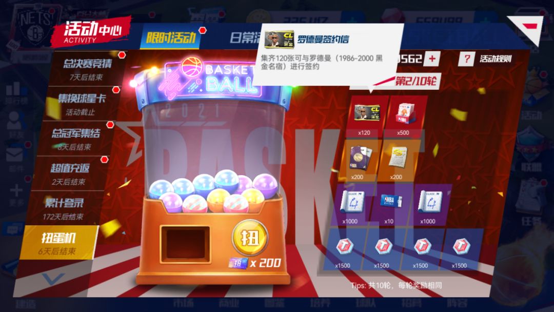 使用“扭蛋券”参与可参与抽奖,摇完扭蛋机中扭蛋,必定获得黑金名宿——罗德曼!