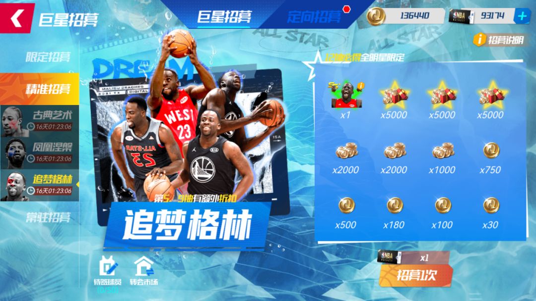 精准招募函限时折扣中!活动期间,可使用【精准招募函】在【精准招募-追梦格林】池中,招募全明星队追梦格林。每次“抽一次”,则随机解锁一个奖励格,获取奖励格中的“全明星球员”或“转会费”。至多抽取12次,成功将全明星队格林签约入队!(卡池不包含球员套装)
