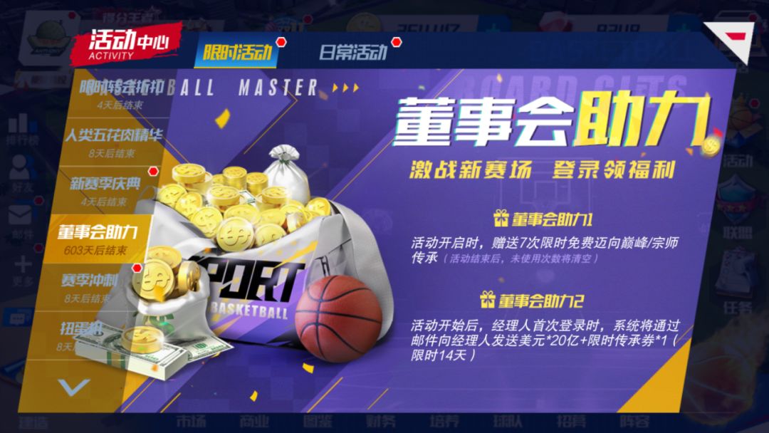 活动开始后,经理人首次登录时,系统将通过邮件向经理人发送20亿美元和一张限时传承券。(限时14天)