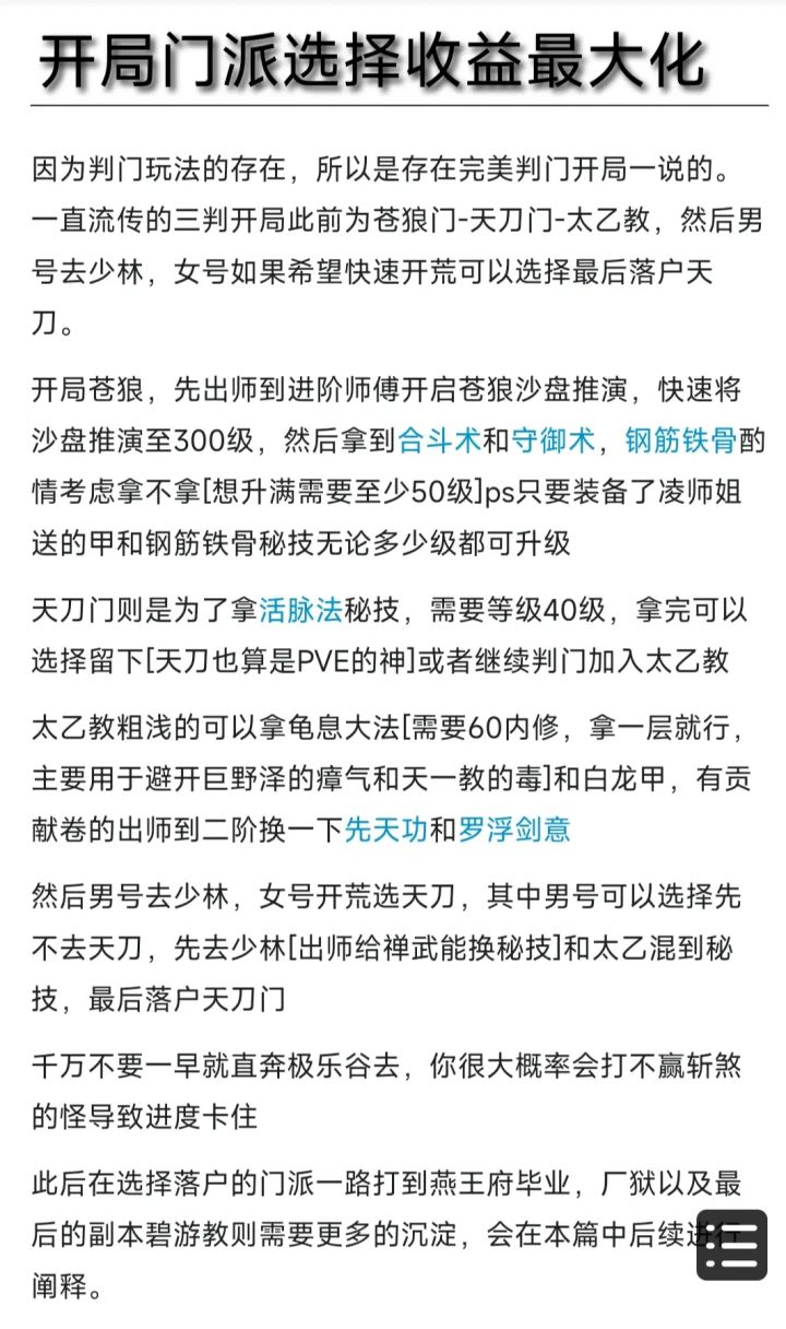 开局3判攻略:进苍狼,拿合斗守御,钢筋可以不拿,然后换天刀,拿活脉就行,再到太乙拿龟息最后回少林学习梦棍,少林梦棍玩到燕王副本通关没问题,燕王过后开始叛门,主角转输出,具体根据自己想玩什么再问,规划路线。3判时记得做门派任务,学习门派内功把贡献花完。合斗守御,龟息不消耗贡献,相当于读书只花时间。