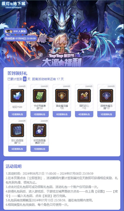 🎁前往《提灯与地下城》TapTap游戏节签到页面,点击【立即签到】,在活动期间内进行累计签到,即可获得对应天数礼包!🎁领取位置: