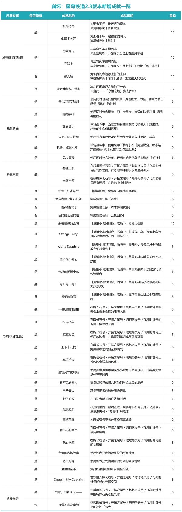 哈喽各位开拓者大家好!2.3版本新增成就一览表来啦!完成所有成就后共可获得235星琼,“肝有余力”的开拓者们千万不要错过了!