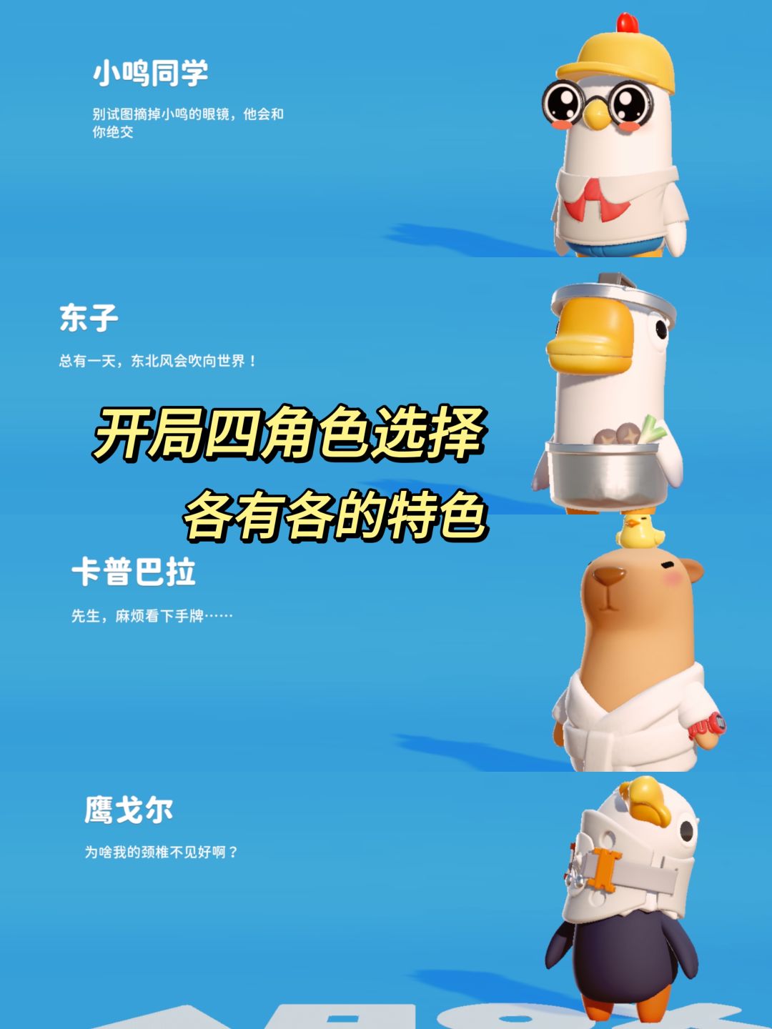 ✨卡普巴拉丨鹰戈尔丨东子丨小鸣同学,四个开局角色都很Q萌,还有更多角色形象等你解锁。