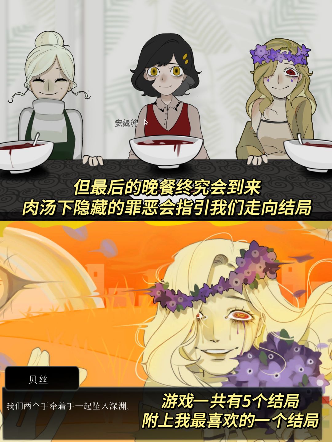 游戏一共有5个结局,每一个都有点让人意难平。虽然我非常喜欢这种有大病的调调,但提醒心理承受能力弱的小伙伴慎入哈⚠️