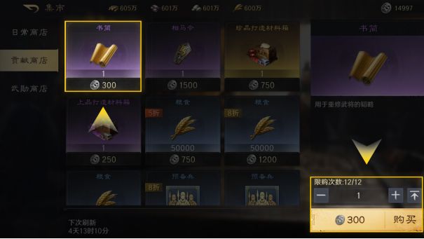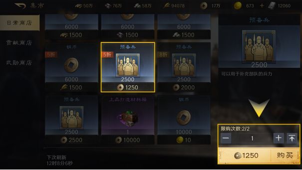 日常商店、贡献商店、武勋商店都可以购买预备兵,快速补充兵力。