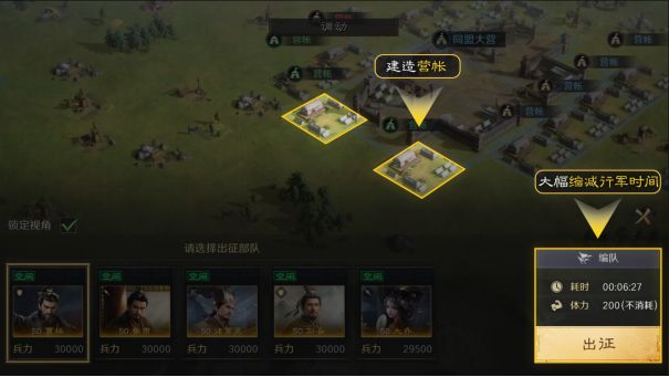 当行军目的地路途较远时,可以在目标处建造营帐,方便后续调动部队。营帐建造时间为90分钟,如有建造需求可以提前建造。玩家可以在营帐中调动部队,调动部队可以大大缩减行军的时间。在城池和同盟大营补给范围内的营帐中,玩家可以消耗辎重快速征兵。
