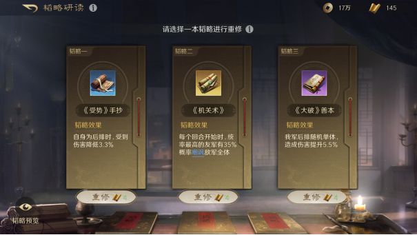 在重修韬略时,要注意韬略种类不会重复出现。例如在第一格出现的韬略种类,不会在后两个韬略格中再次出现。